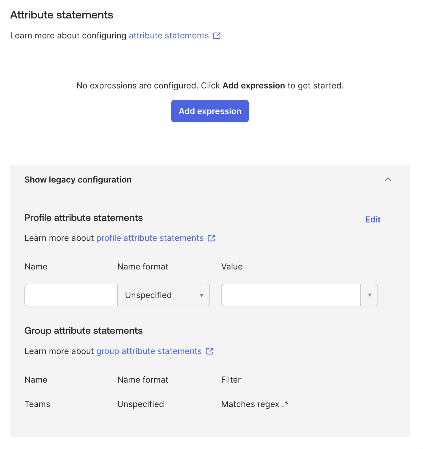 3. Scroll down to the Attribute statements section and find Group attribute statements (it may be under "Show legacy configuration").