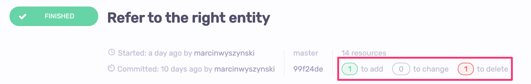 If the planning phase is successful (which includes policy evaluation), Spacelift analyses the diff and counts the resources and outputs that would be added, changed and deleted if the changes were to be applied. Here's one example of one such delta being reported: