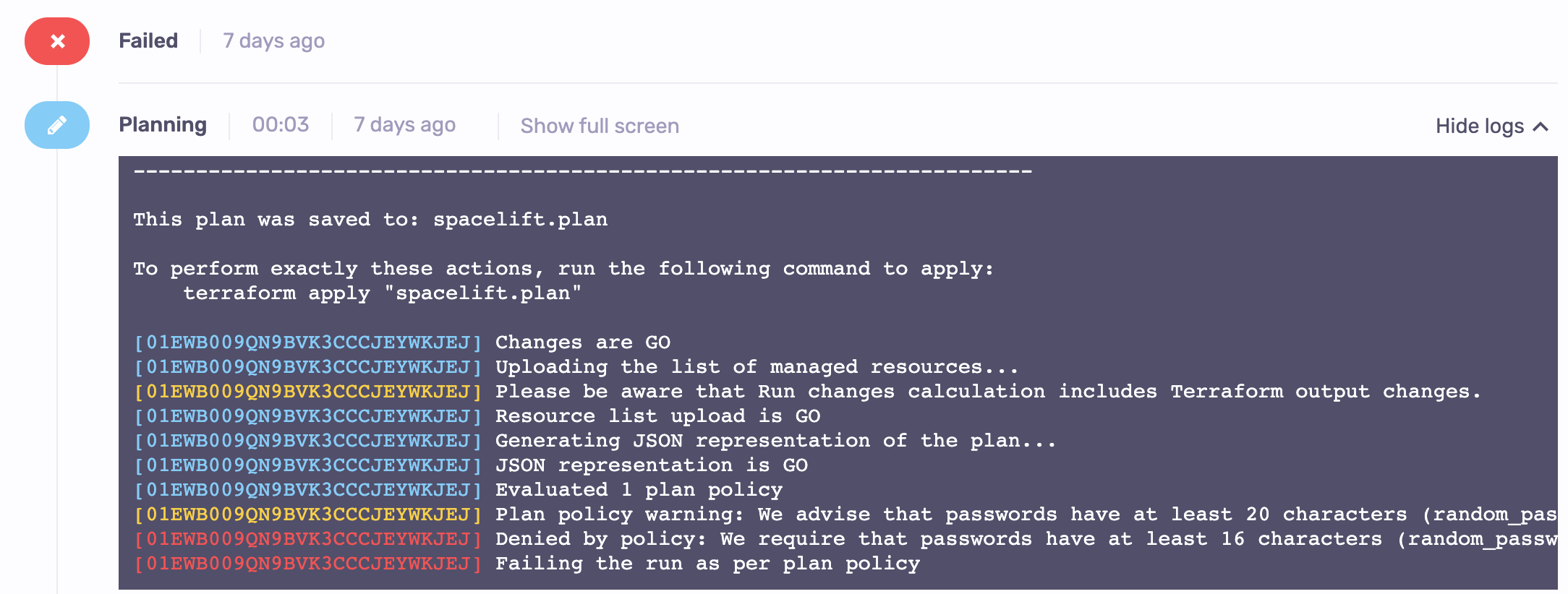 If any plan policies are attached to the current stack, each of these policies is evaluated to automatically determine whether the change is acceptable according to the rules adopted by your organization. Here is an example of an otherwise successful planning phase that still fails due to policy violations: