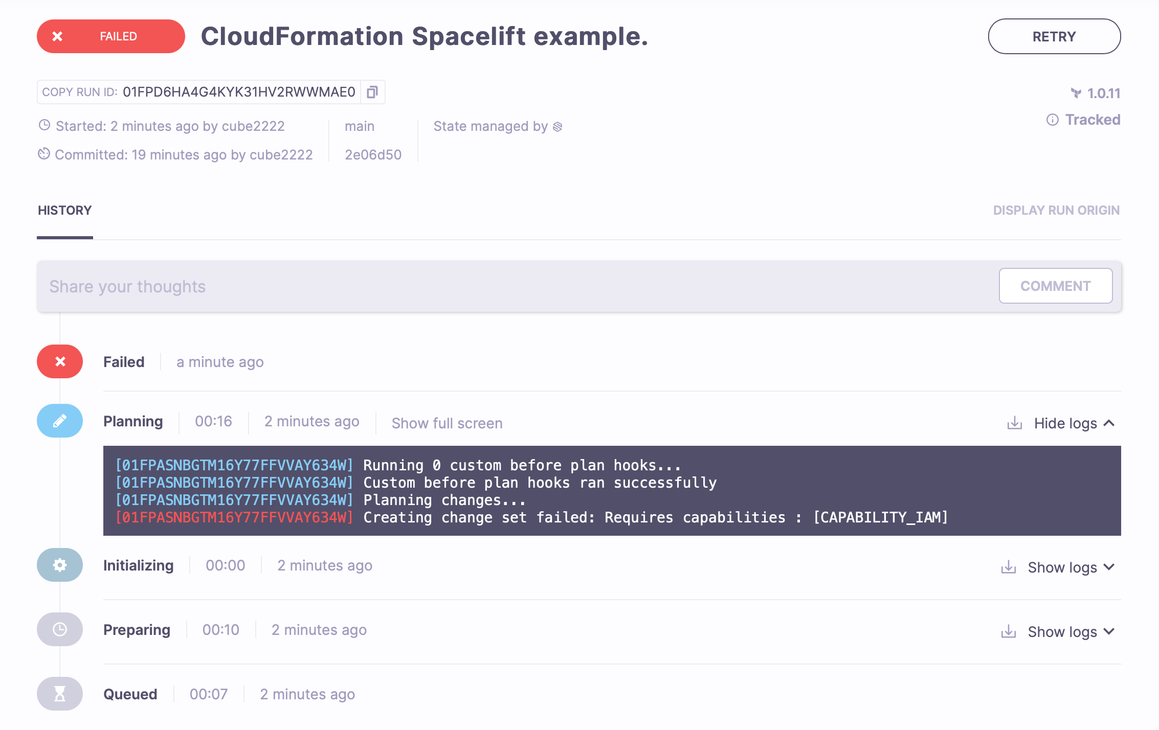 Triggering a run again, you should successfully see it get through the planning phase and end up in the unconfirmed state.