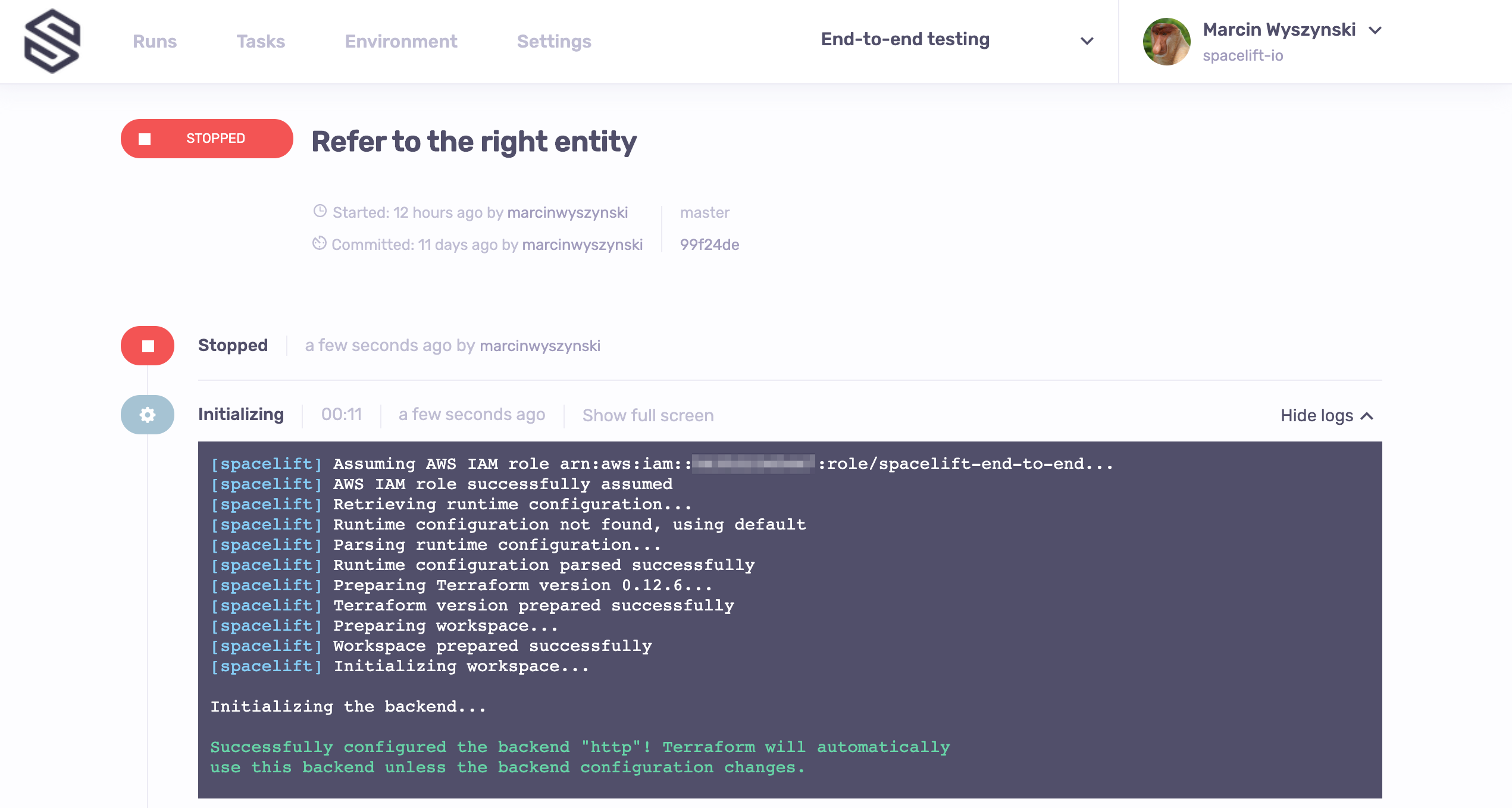 Stopped state indicates that a run has been stopped while Initializing or Planning, either manually by the user or - for proposed changes - also by Spacelift. Proposed changes will automatically be stopped when a newer version of the code is pushed to their branch. This is mainly designed to limit the number of unnecessary API calls to your resource providers, though it saves us a few bucks on EC2, too.