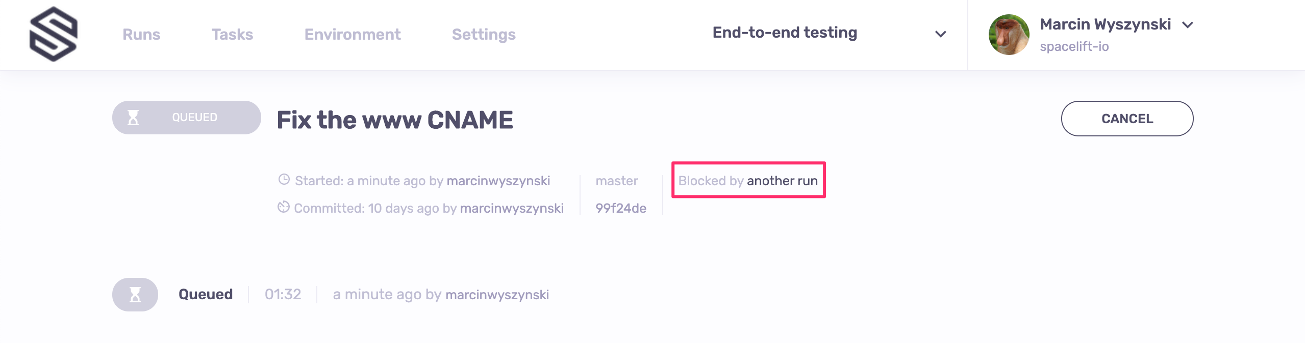 Let's start with the latter - more common - scenario. Spacelift serializes all state-changing operations to the Stack. Both tracked runs and tasks have the capacity to change the state, they're never allowed to run in parallel. Instead, each of them gets an exclusive lock on the stack, blocking others from starting.