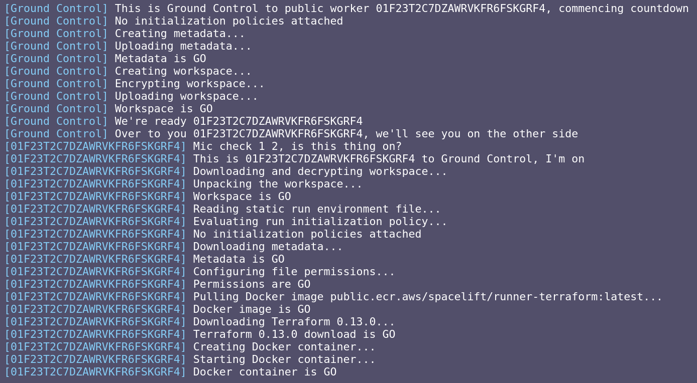 Regardless of whether you end up using a private or a public worker pool, each Spacelift run involves a handover between spacelift.io (which we like to call the mothership) and the worker node. After the handover, the worker node is fully responsible for running the job and communicating the results of the job back to the mothership.