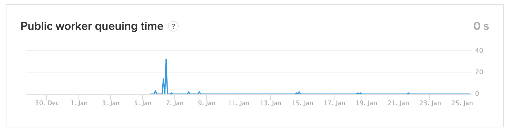 The other scenario is just running out of available workers. If you're using the public worker pool, you can track its availability on our status page. In particular, you should look at a system metric called Public worker queuing time. It indicates how long has the oldest run spent in the queue since becoming eligible for processing: