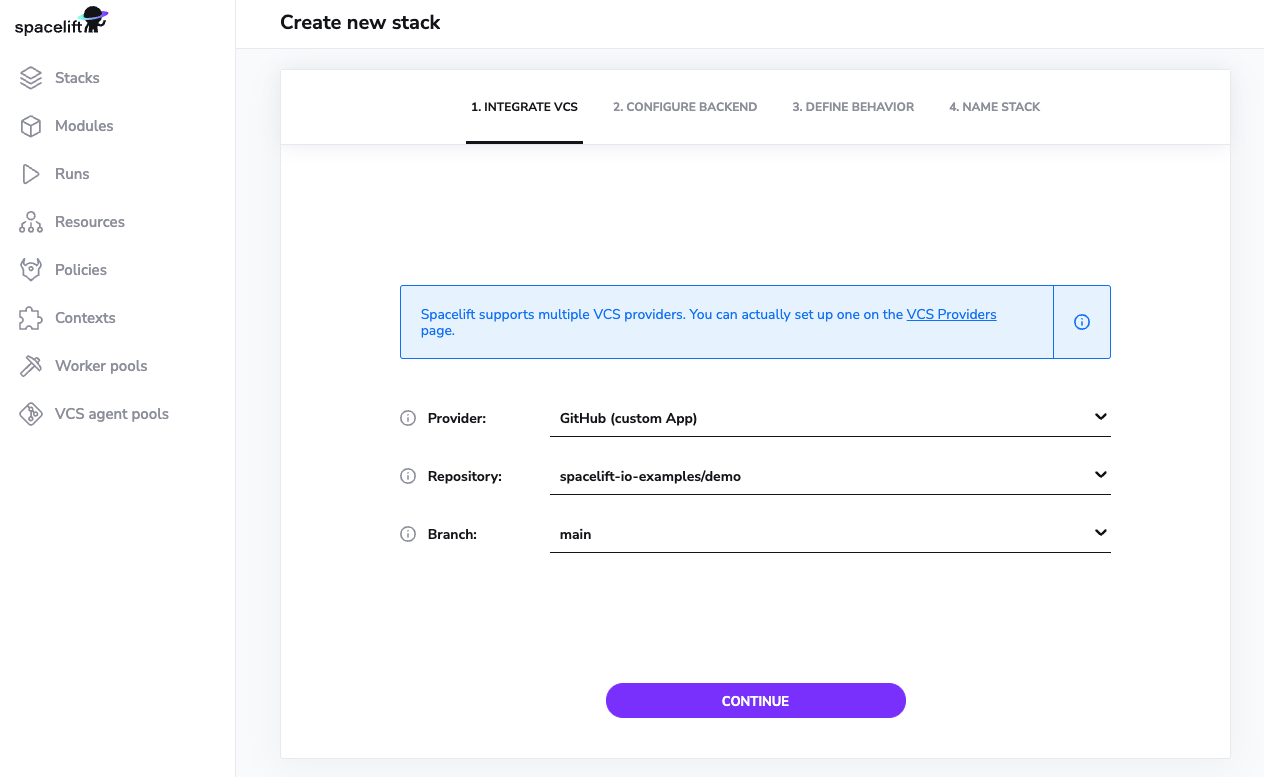 In the Integrate VCS tab, choose your VCS provider, select the repository that you gave access to Spacelift in the first step and select a branch that you want to be attached with your Stack. Click Continue.