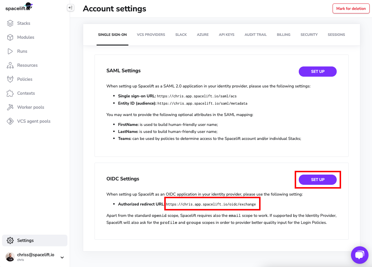Please note you'll need to be an admin on the Spacelift account to access the account settings to configure Single Sign-On.