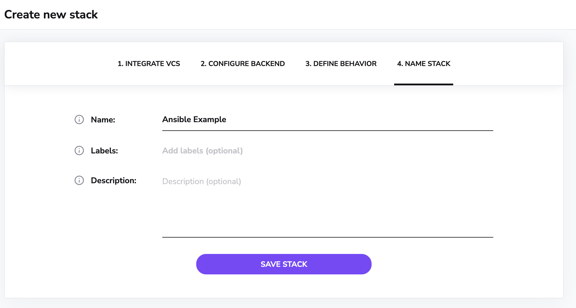 Finally, choose a name for your Spacelift Stack on the last page. We'll use Ansible Example again.