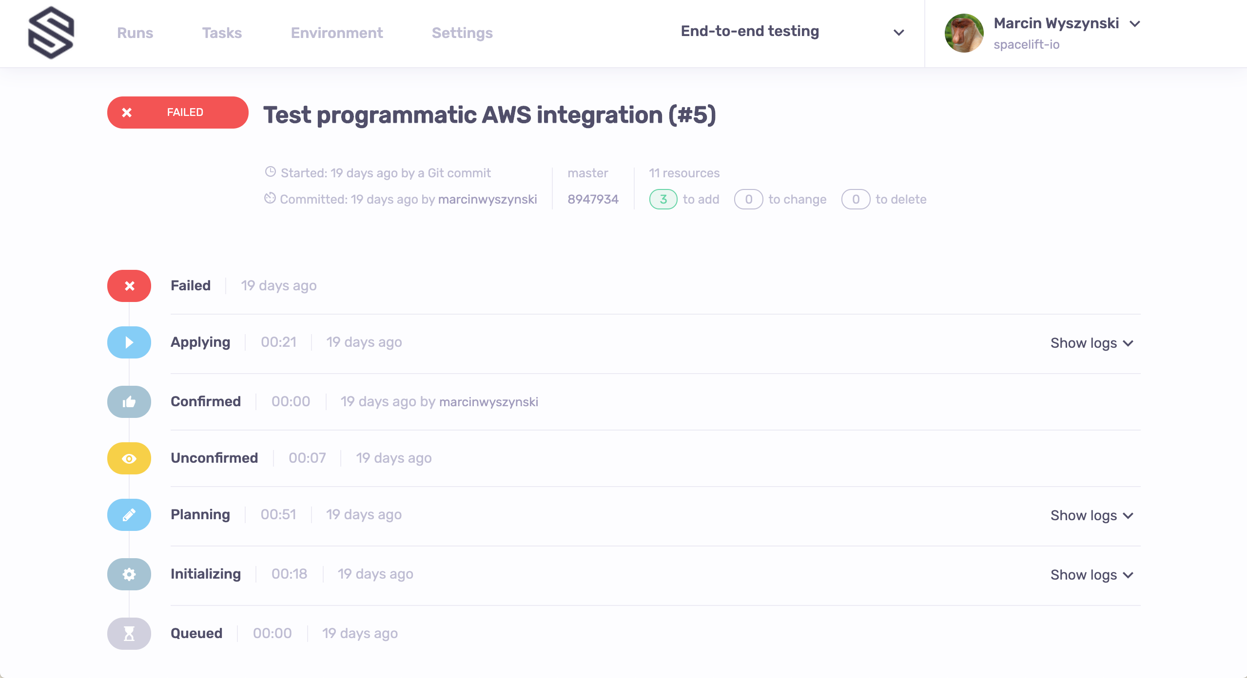 One bit you might not want to miss though, is the guaranteed ability to map the change to a particular run or task that we described in the previous section. One way of fixing that would be to use the TF_VAR_spacelift_run_id computed environment variable available to each Spacelift workflow. Conveniently, it's already a Terraform variable, so a setup like this should do the trick: