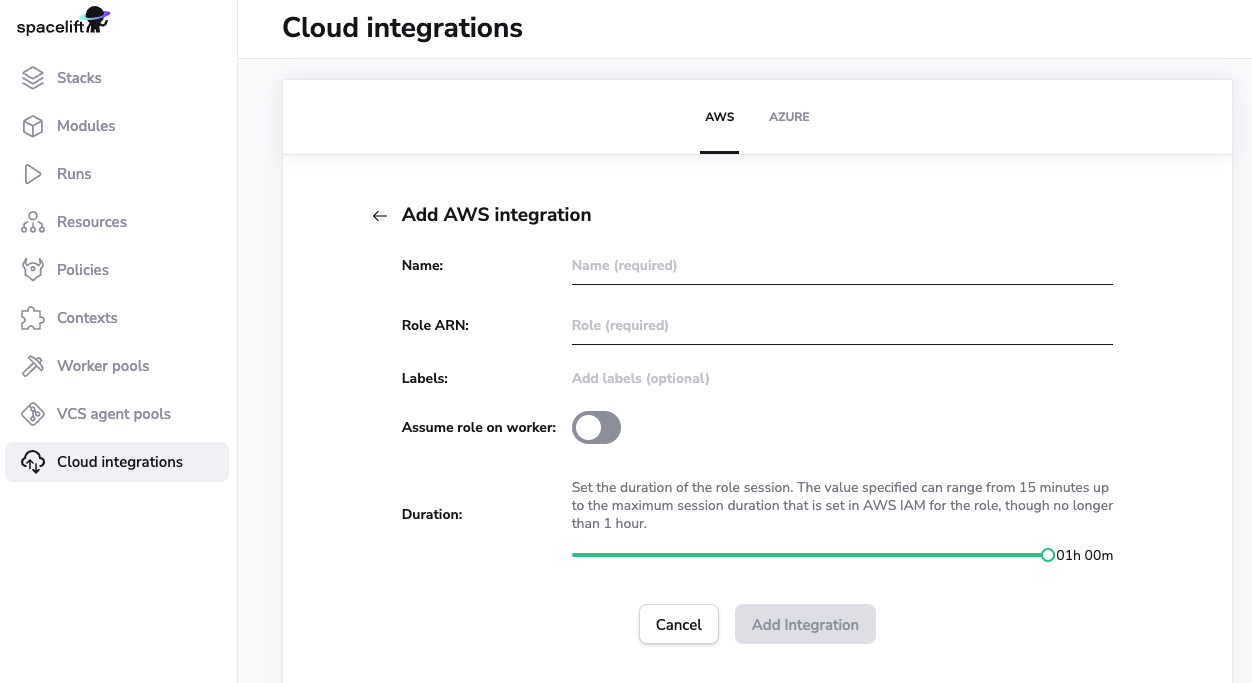 Now that you have an IAM Role created, navigate to the Cloud Integration page from the Spacelift navigation sidebar.