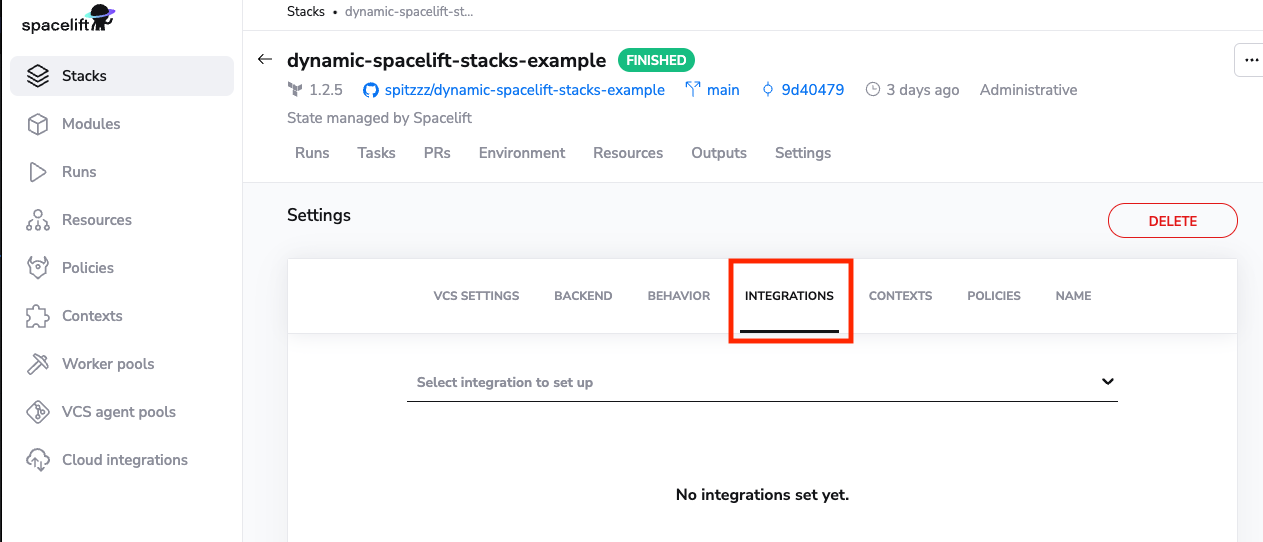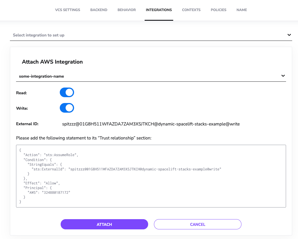 spacelift_aws_roleresource. - Attach your new integration to your stack via the