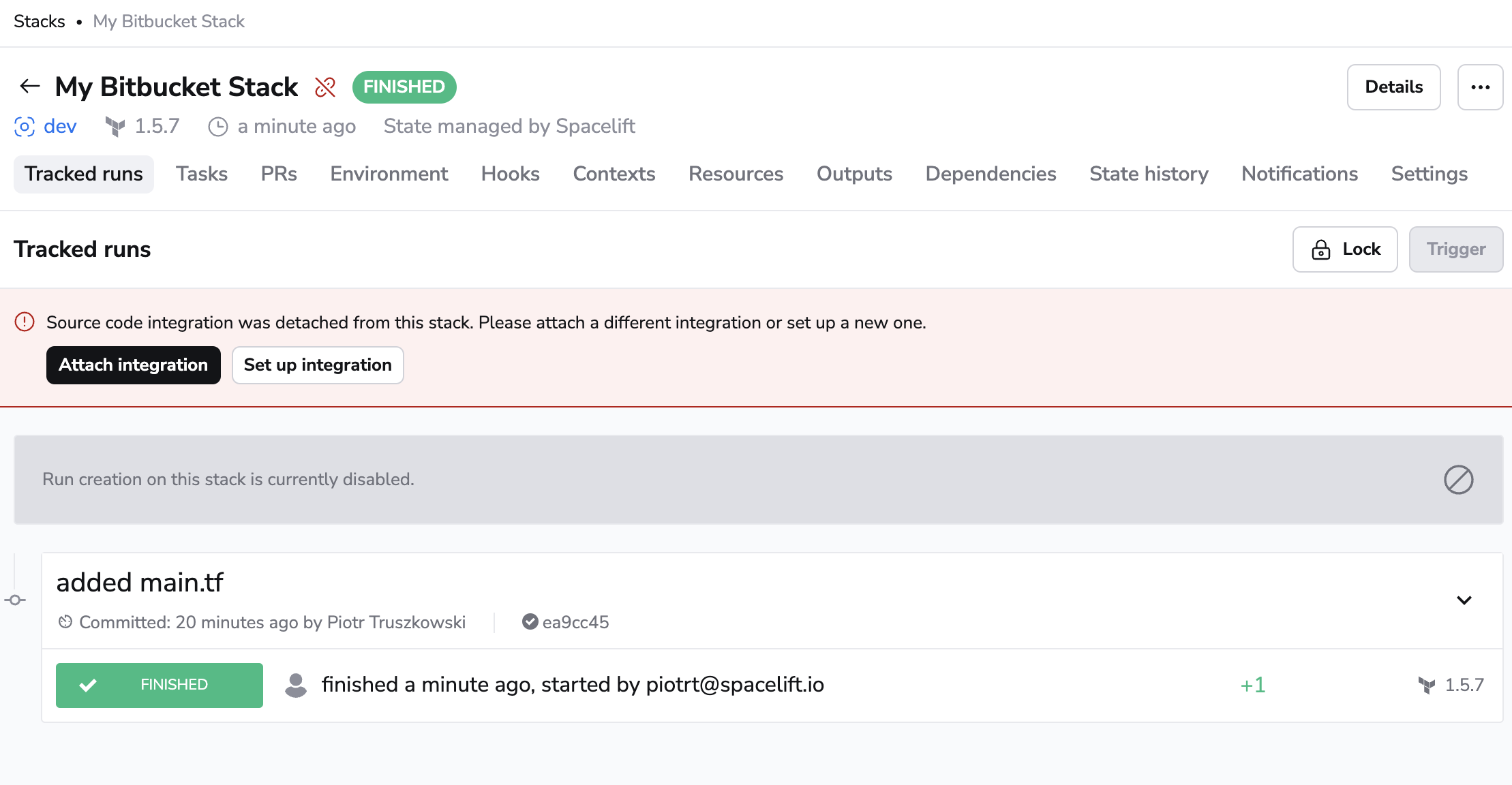 When a stack has a detached integration, it will no longer be able to receive webhooks from Bitbucket Data Center and you won't be able to trigger runs manually either.