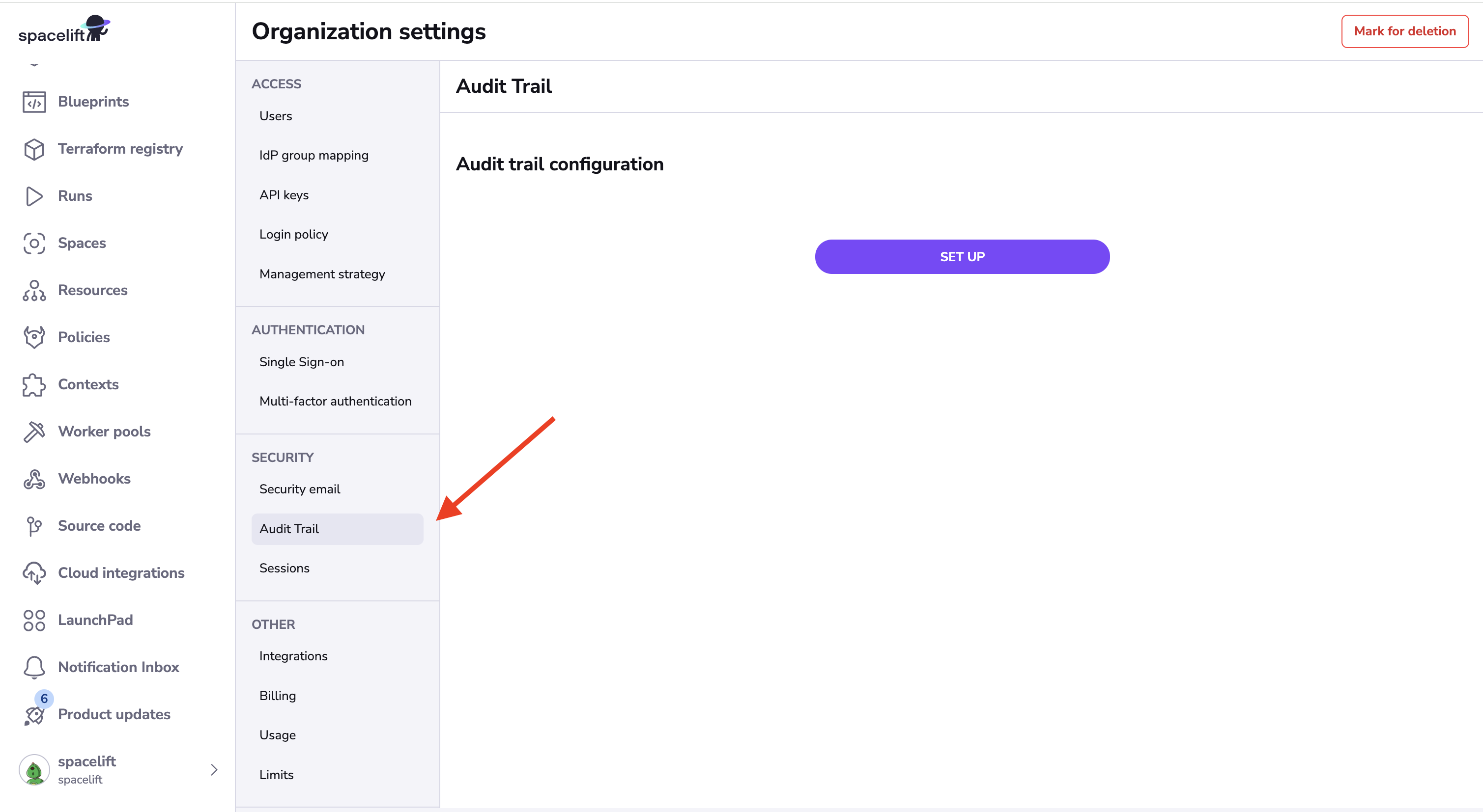 In order to set up the audit trail, navigate to the Audit trail section of your account settings and click the Set up button: