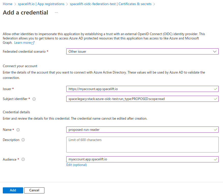 Workload federation in Azure requires the subject claim of the OIDC token to exactly match the federated credential, and doesn't allow wildcards. Because of this you will need to repeat the same process and add a number of different federated credentials in order to support all the different types of runs for your Stack or module. For example for a stack called azure-oidc-test in the legacy space you need to add credentials for the following subjects:
