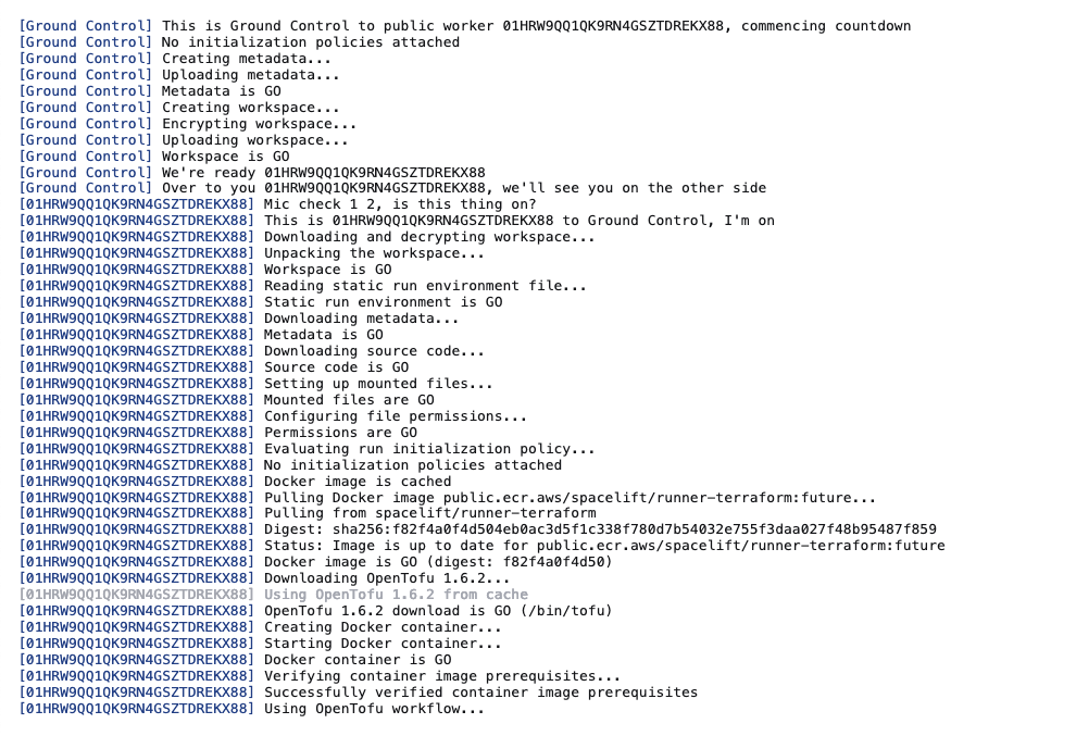 The preparing state is the first one where real work is done. At this point both the run is eligible for processing and there's a worker node ready to process it. The preparing state is all about the handover and dialog between spacelift.io and the worker.