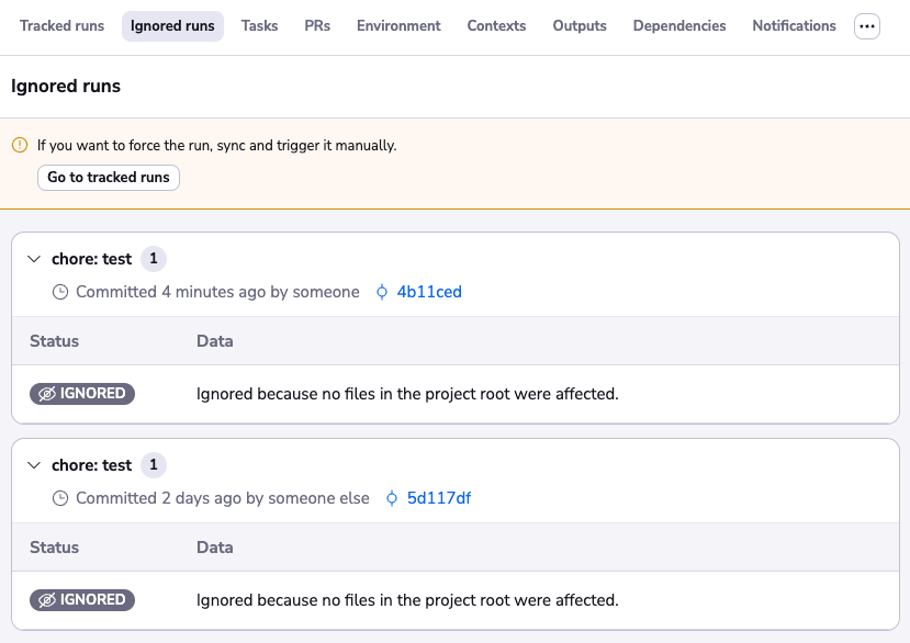 If you want to go back in time and try to understand why a run has not been triggered, you can open the Ignored runs tab.