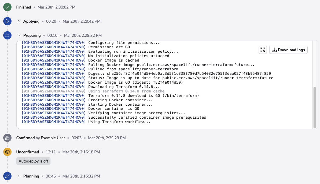 This preparation phase is very unlikely to fail, but if it does (eg. the worker node becomes unavailable during the transition), the run will transition to the terminal failed state. If the handover succeeds, or the run does not go through the manual approval process, the applying phase begins and attempts to deploy the changes. Here's an example: