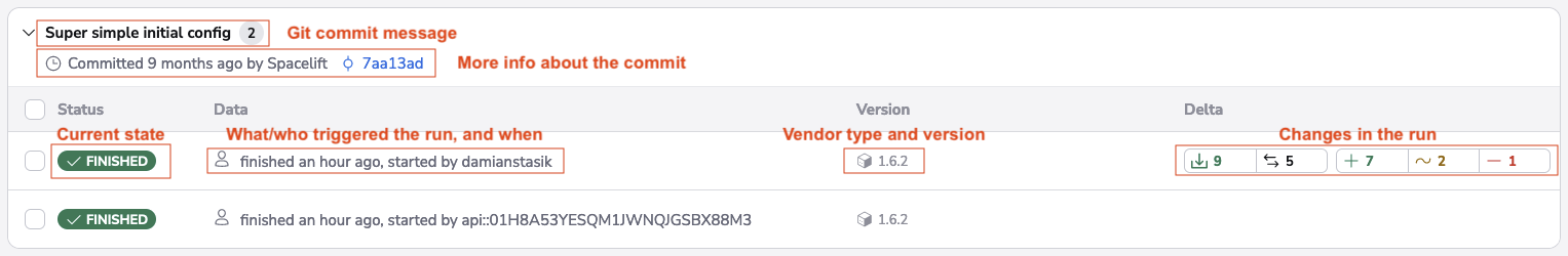 Also worth noting is the colorful delta counter present on some runs - as long as the planning phase was successful this visually represents the resources and outputs diff introduced by the change: