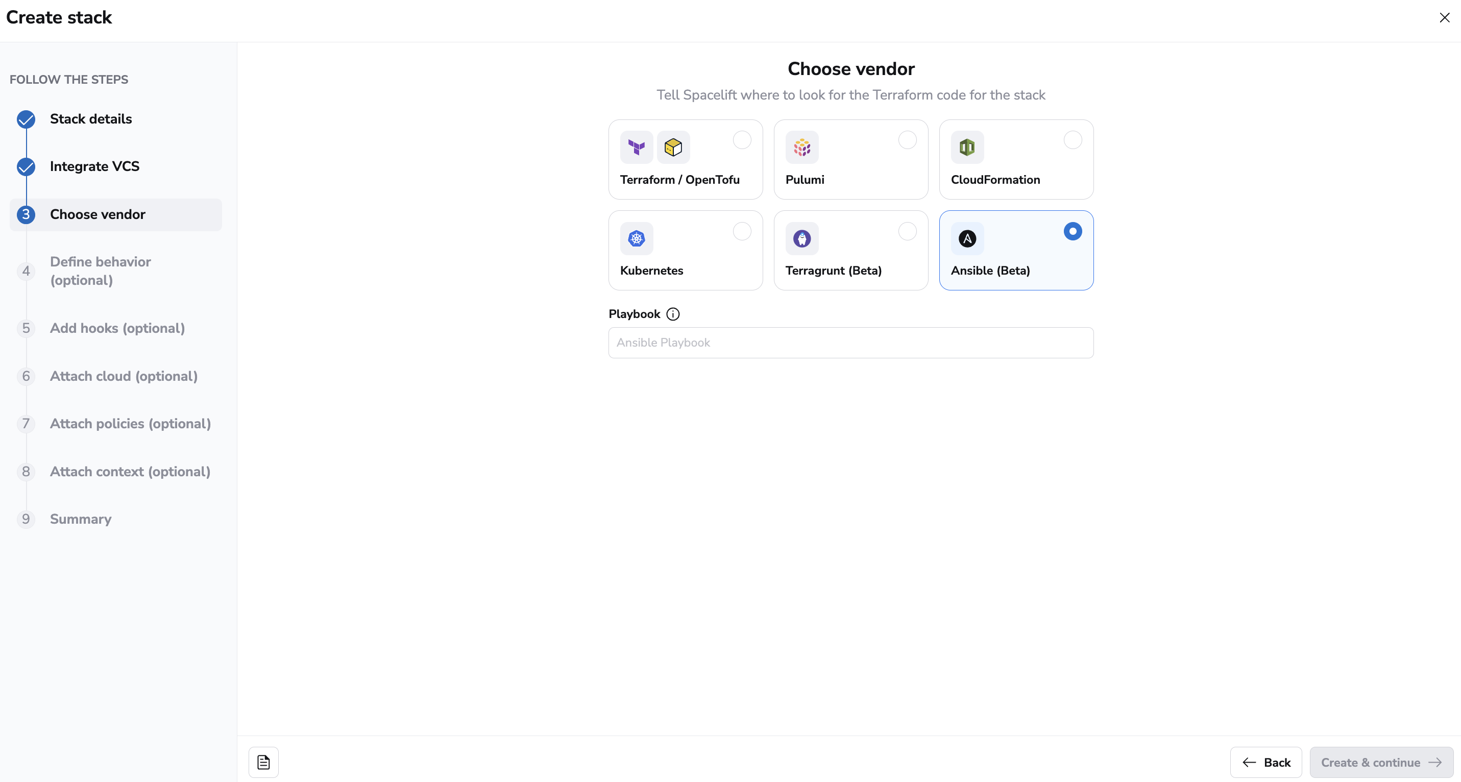 When you create an Ansible stack in Spacelift, you have the option to select the playbook file you want to use. You can define policies for your stack as you would do for any other stack.
