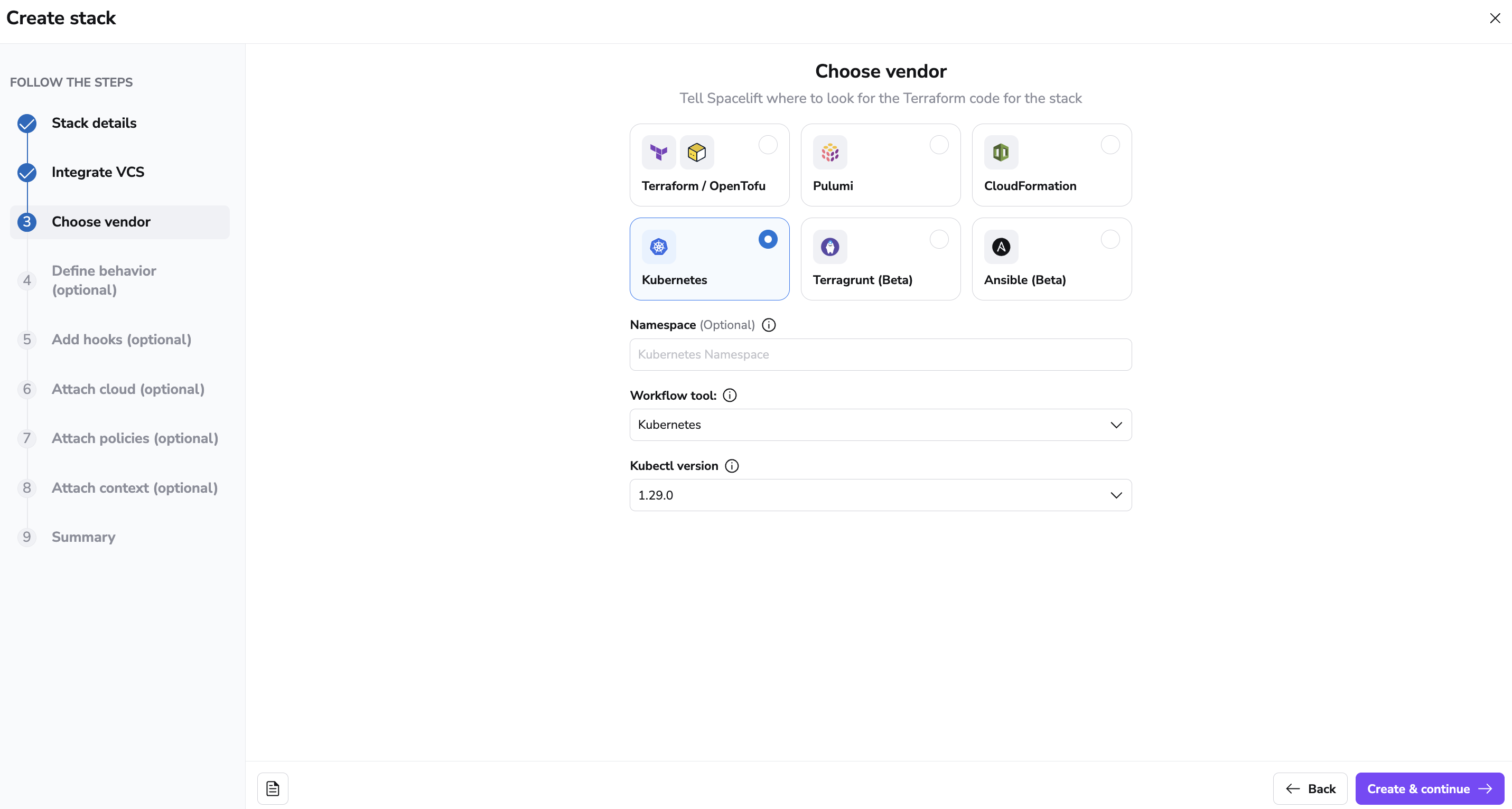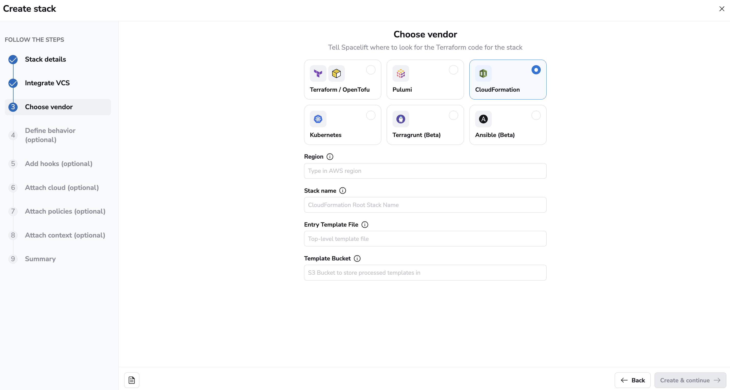At this point you'll probably know whether you want to create a Terraform, OpenTofu, Terragrunt, AWS CloudFormation, Pulumi, Ansible or Kubernetes stack. Each of the supported vendors has some settings that are specific to it, and the backend configuration step is where you can define them.