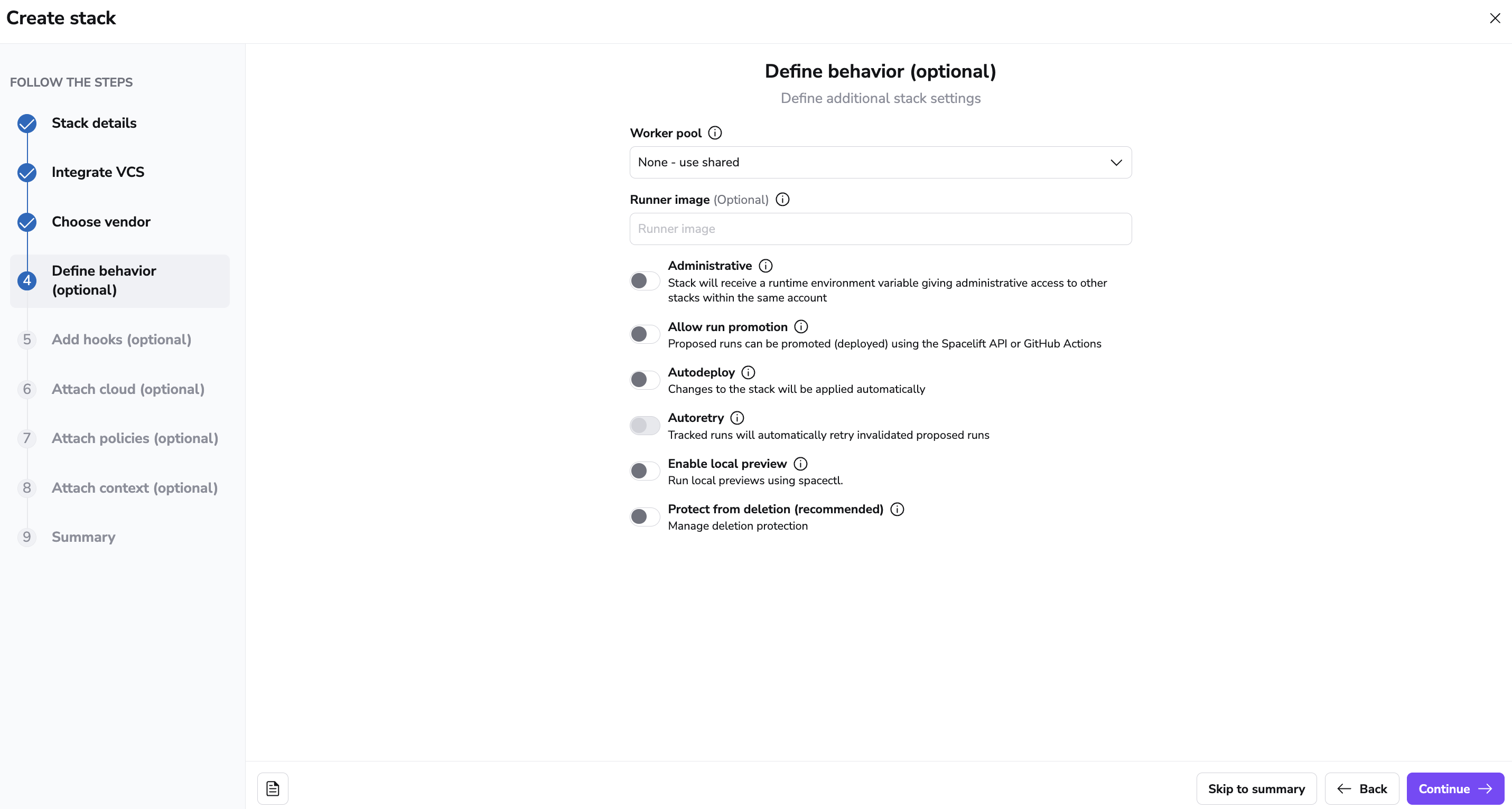 Regardless of which of the supported backends (Terraform, Pulumi etc.) you're setting up your stack to use, there are a few common settings that apply to all of them. You'll have a chance to define them in the next step: