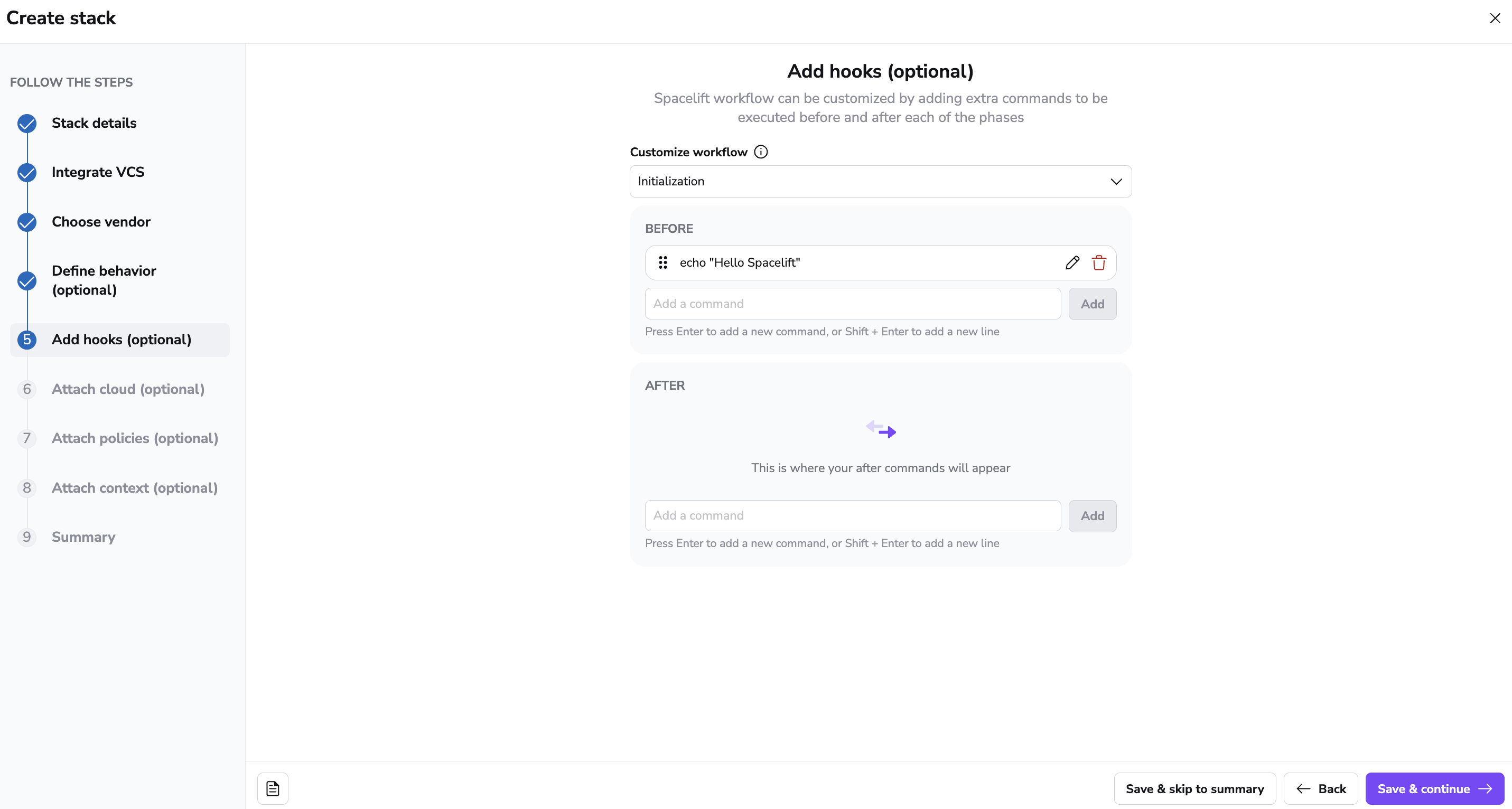 You also have the ability to control what happens before and after each runner phase using Stack Hooks. In this phase, you can define commands that run in between the following phases: