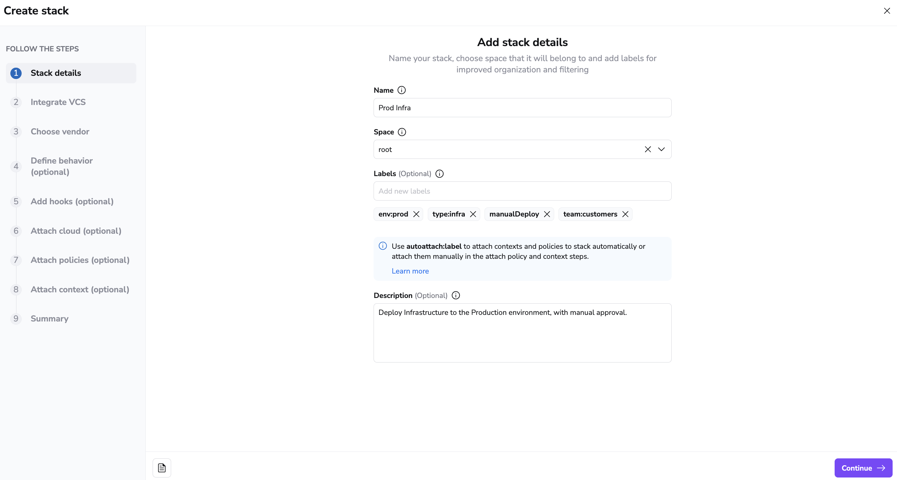 You'll be able to change the name and description later, too - with one caveat. Based on the original name, Spacelift generates an immutable slug that serves as a unique identifier of this stack. If the name and the slug diverge significantly, things may become confusing.