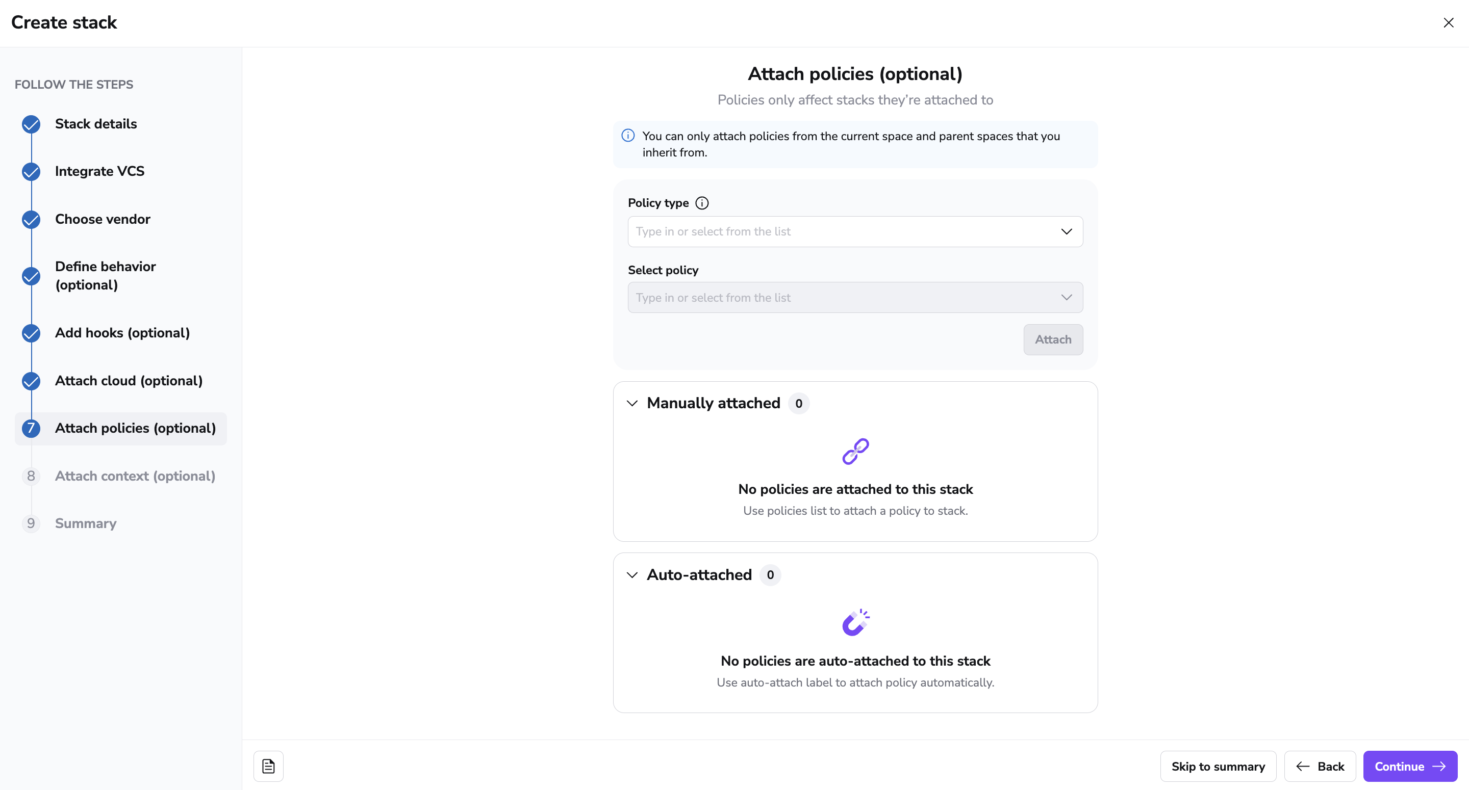 In this section, you can attach the following policy types:
