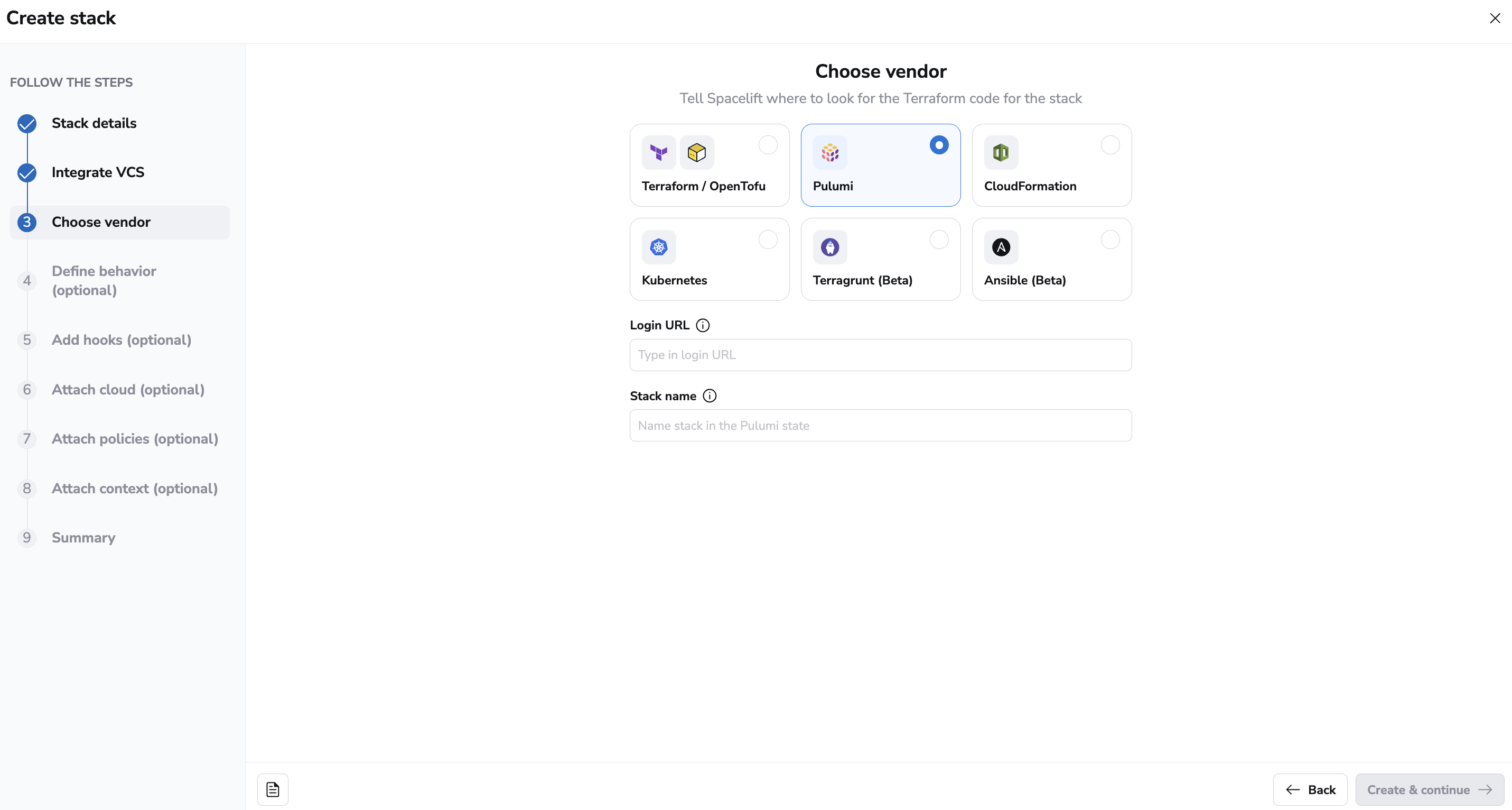 When creating a Pulumi stack, you will need to provide two things. First, the login URL to your Pulumi state backend, as currently we don't provide one like we do for Terraform, so you will need to bring your own.