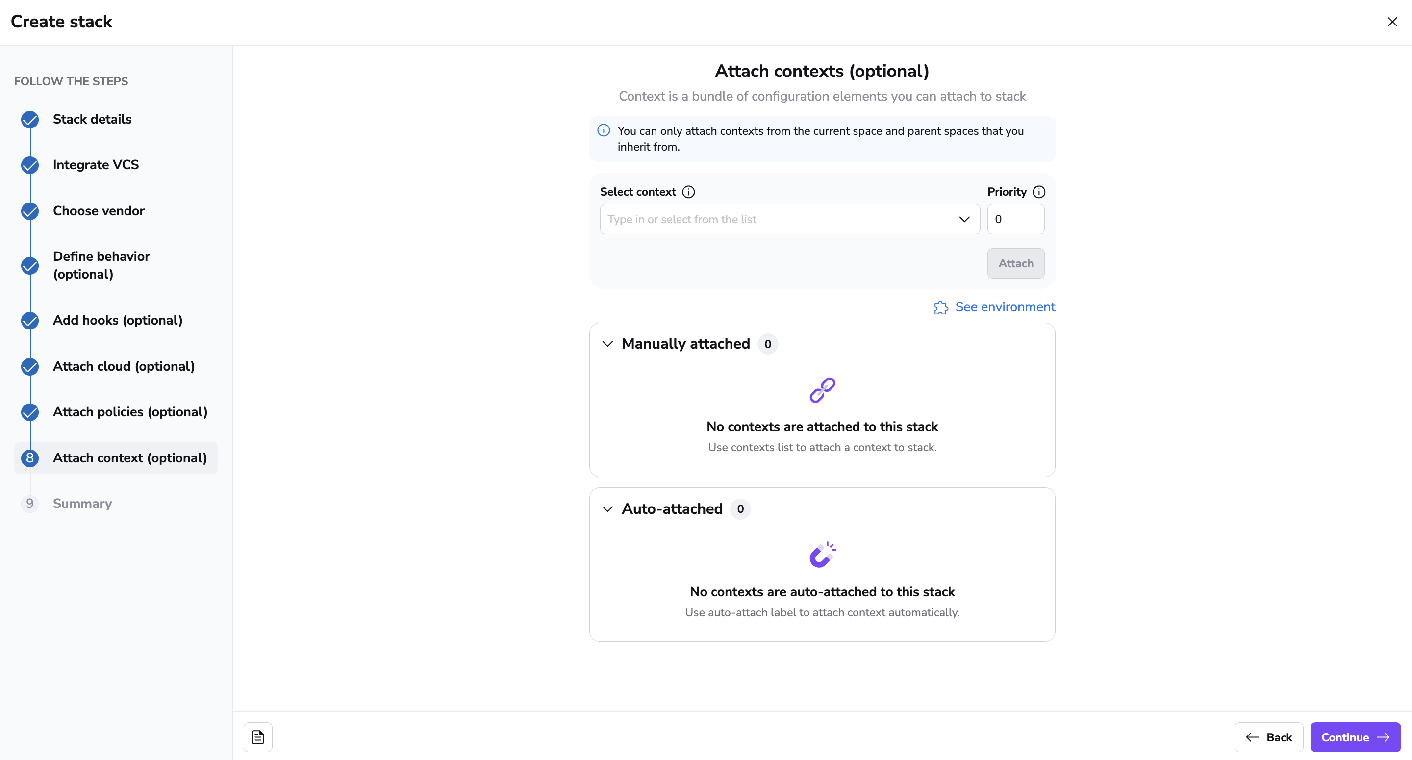 Contexts are sets of environment variables and related configuration,including hooks that can be shared across multiple stacks. By attaching a context, you ensure your stack has all the necessary configuration elements it needs to operate, without repeating the setup for each stack.