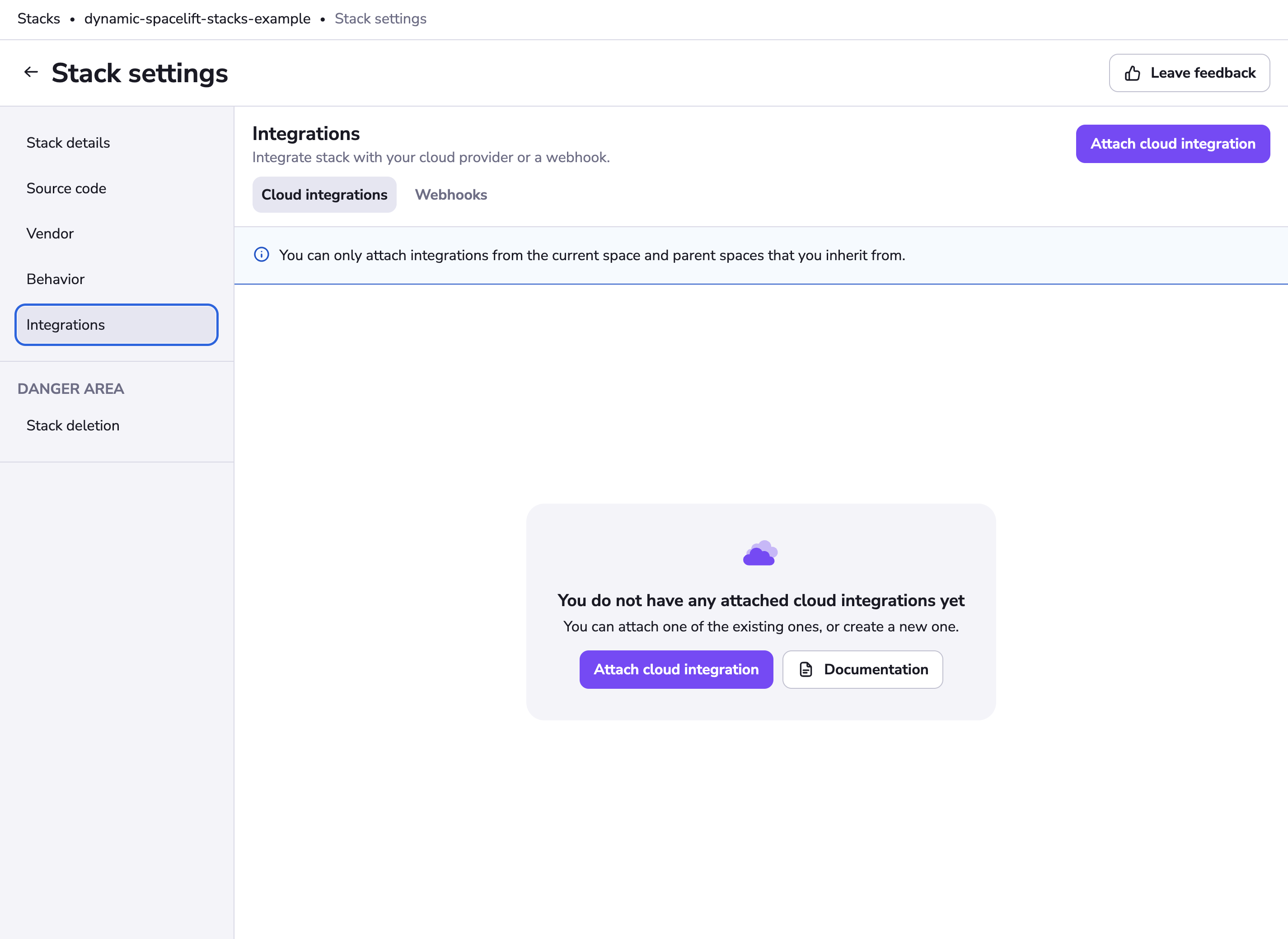 Now that the integration has been created, you need to attach it to one or more stacks. To do this, navigate to a stack that you want to attach your integration to: