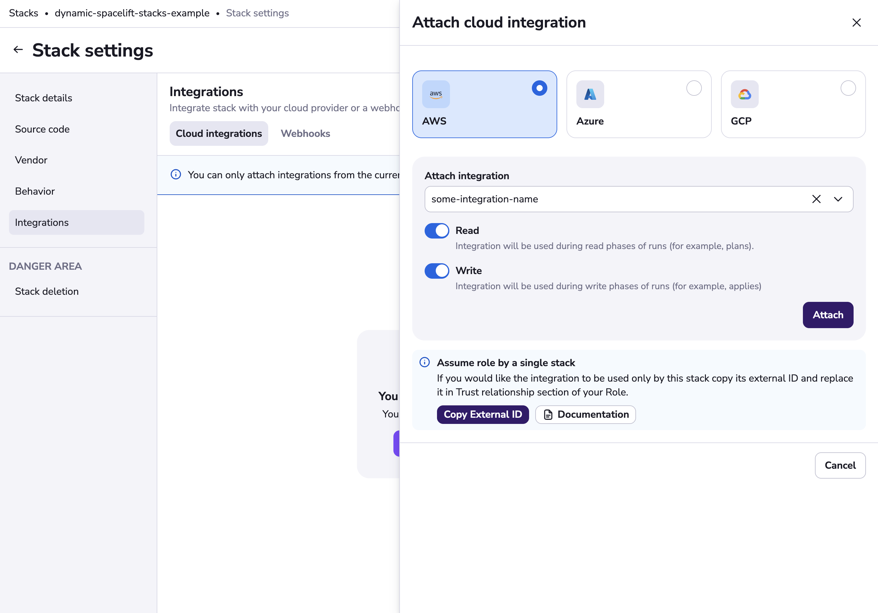 You can attach an AWS integration as read, write or read-write, and you can attach at most two integrations to any single stack. Read indicates that this integration will be used during read phases of runs (for example, plans), and Write indicates that this integration will be used during write phases of runs (for example, applies).