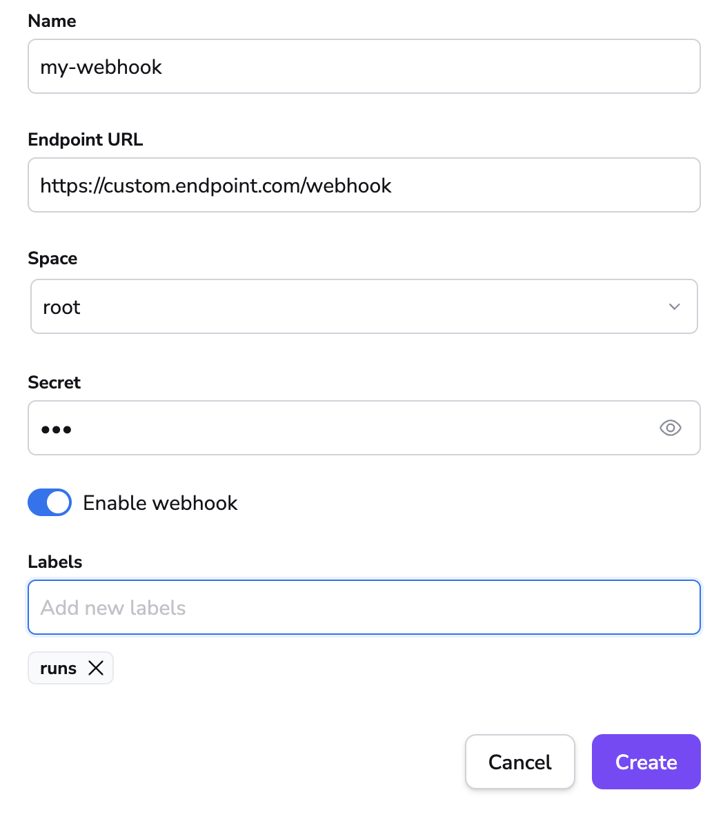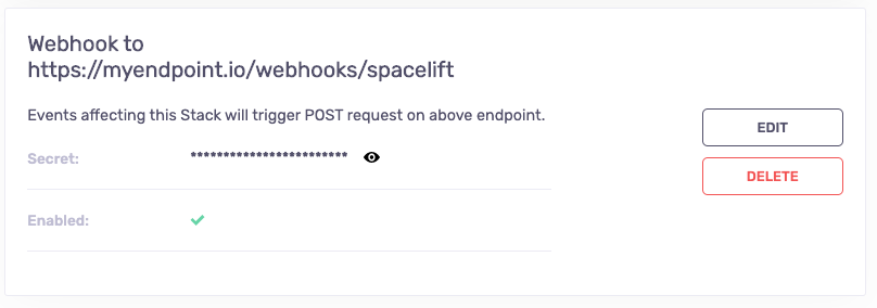 You will be presented with a simple setup form that requires you to provide and endpoint to which the payload is sent, and an optional secret that you can use to validate that the incoming requests are indeed coming from Spacelift: