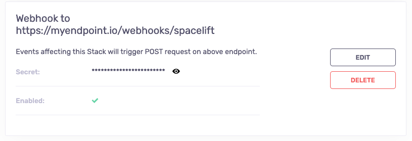 Unlike some other secrets in Spacelift, the webhook secret can be viewed by anyone with read access to the stack. If you suspect foul play, consider regenerating your secret.