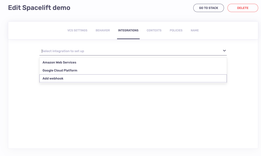 Webhooks can be set up by Spacelift administrators on per-stack basis. In order to do that, navigate to the Integrations section of the stack settings view. From the list of available integrations, select the Add webhook option: