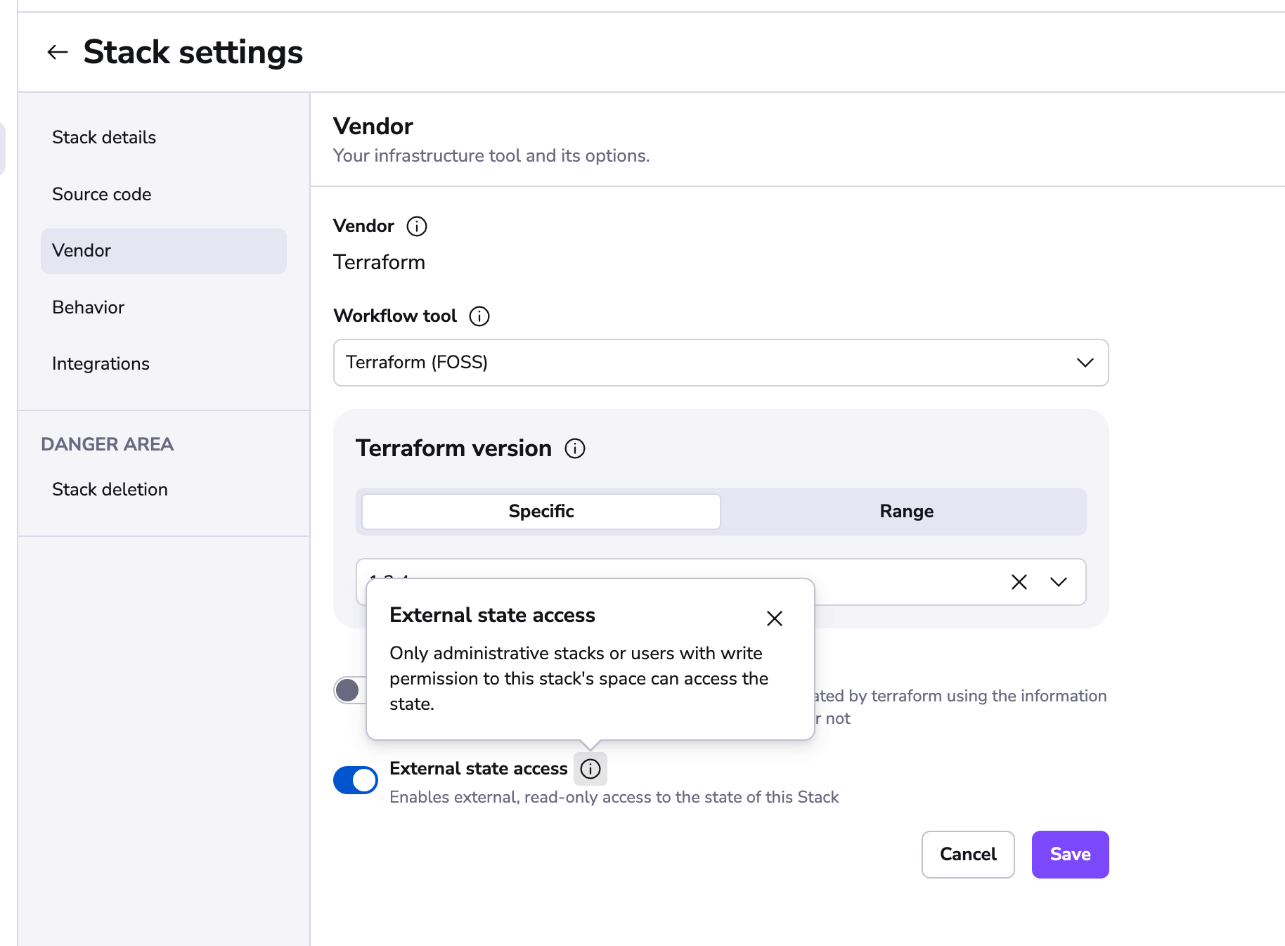 External state access allows you to read the state of the stack from outside authorized runs and tasks. In particular, this enables sharing the outputs between stacks using the Terraform mechanism of remote state or even accessing the state offline for analytical or compliance purposes.