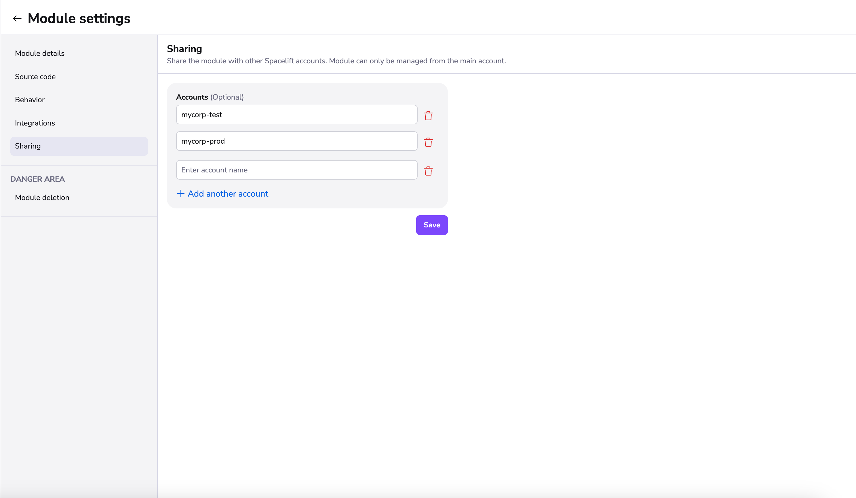 In this step, you can share module with different Spacelift accounts, you just need to add their names in subdomain form (all lowercase). You can find more about module sharing here.