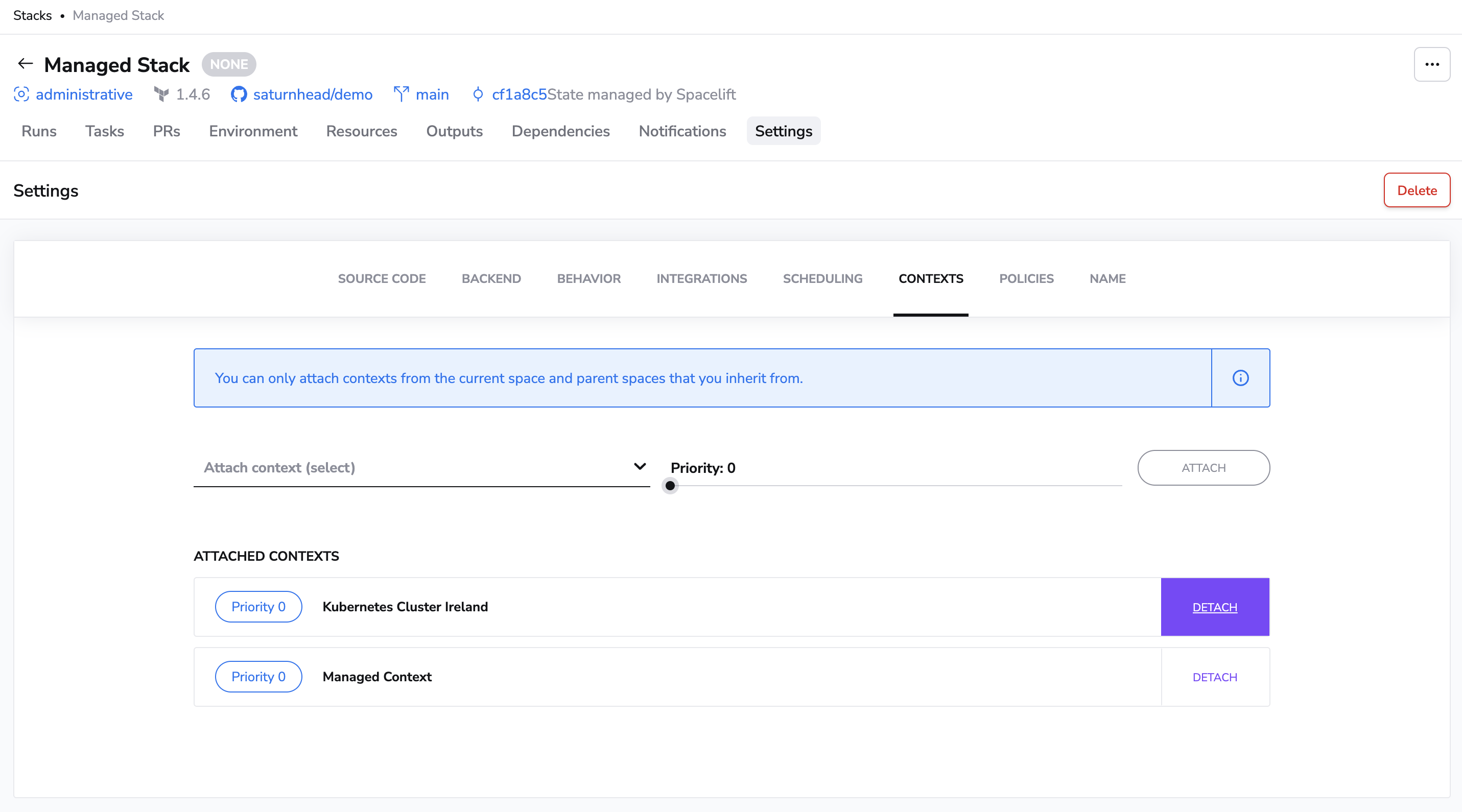 In order to detach the context, you can just press the Detach button and the context will stop contributing to the stack's environment: