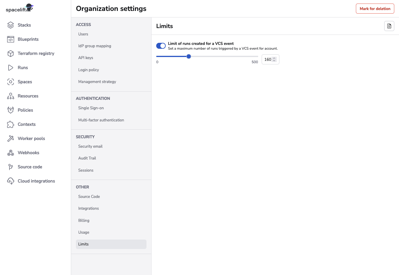 You can also limit the number of runs being created for a VCS event by navigating to Organization settings and clicking on Limits.