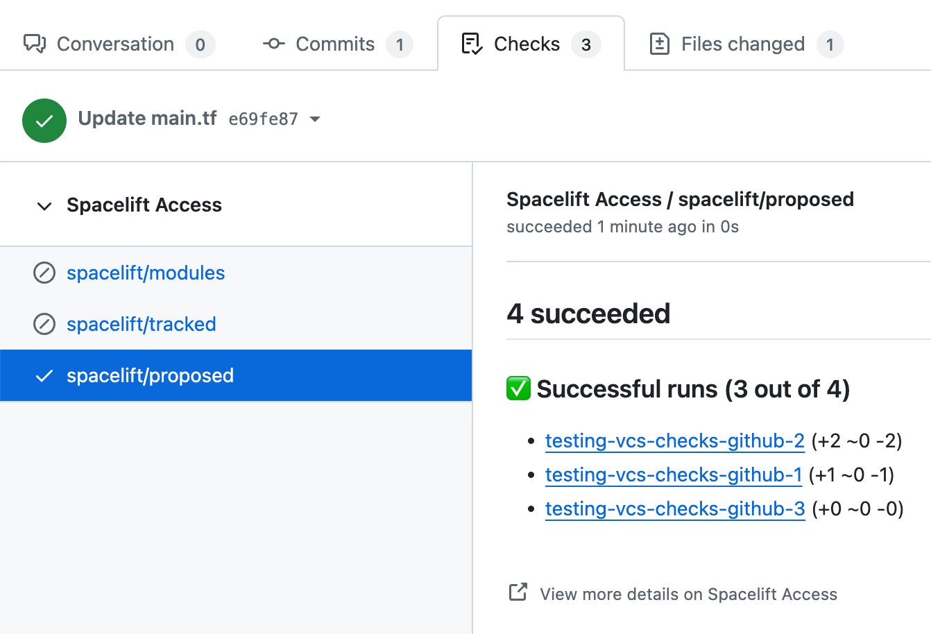 At this point, a proposed run is triggered by the push notification, and the result of running terraform plan with the new code (but existing state and configuration) is reported to the Pull Request.