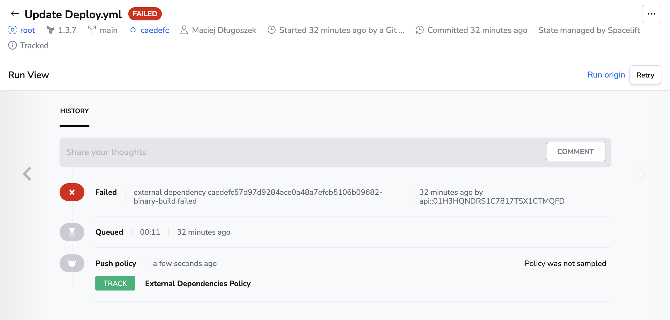 Having the policy and the pipeline defined, we can now test it. Creating a new commit in the repository will trigger the pipeline. As we can see a run was created in Spacelift, but it's in queued state. The run will not start until all the dependencies are marked as finished or skipped.