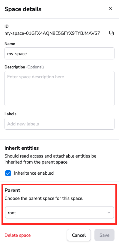 Changing a parent for a space is possible only if after the re-parenting process all the stacks in the whole affected subtree would still be able to access any entities that are attached outside of the subtree, in compliance with the inheritance rules.