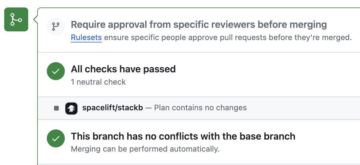 masterwithout a successful run by requiring a successful status check from your stack. - Decide whether you should require a manual review before merging the Pull Request on top of Spacelift's automated checks.