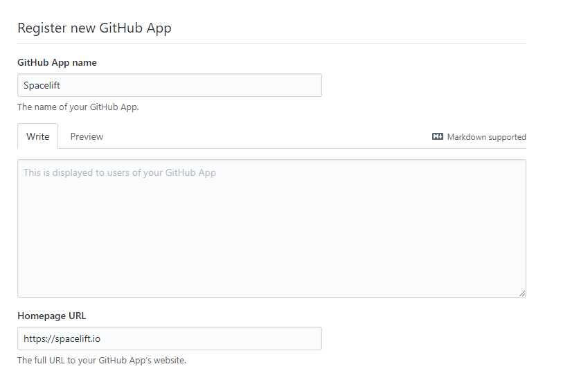 - Give your app a name and homepage URL (these are only used for informational purposes within GitHub):