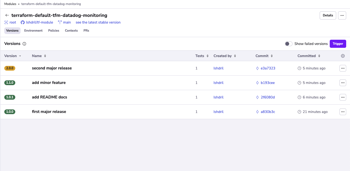 Whenever tests succeed on a tracked change, a new Version is created based on the module_version in the configuration. Important thing to note is that Spacelift will not let you reuse the number of a successful version, and will require you to strictly follow semantic versioning - ie. you can't go to from 0.2.0 to 0.4.0, skipping 0.3.0 entirely.