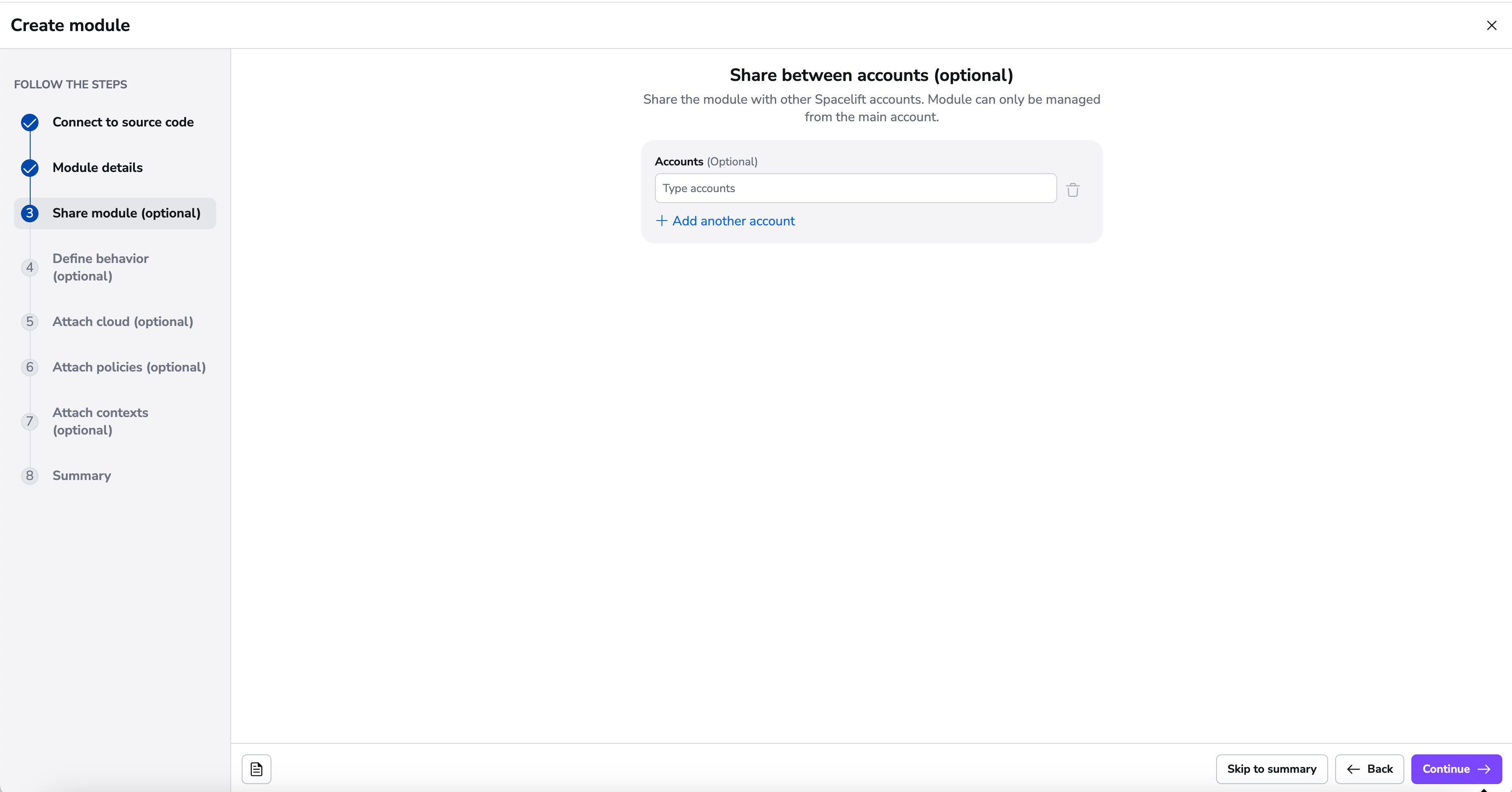 In this step, you can share module with different Spacelift accounts, you just need to add their names in subdomain form (all lowercase). You can find more about module sharing here.