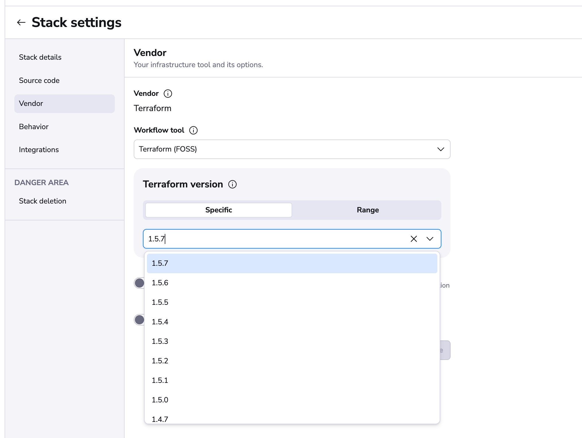 There are two ways to tell Spacelift which Terraform version to use. The main one is to set the version directly on the stack. The version can be set in the Vendor section of the stack configuration: