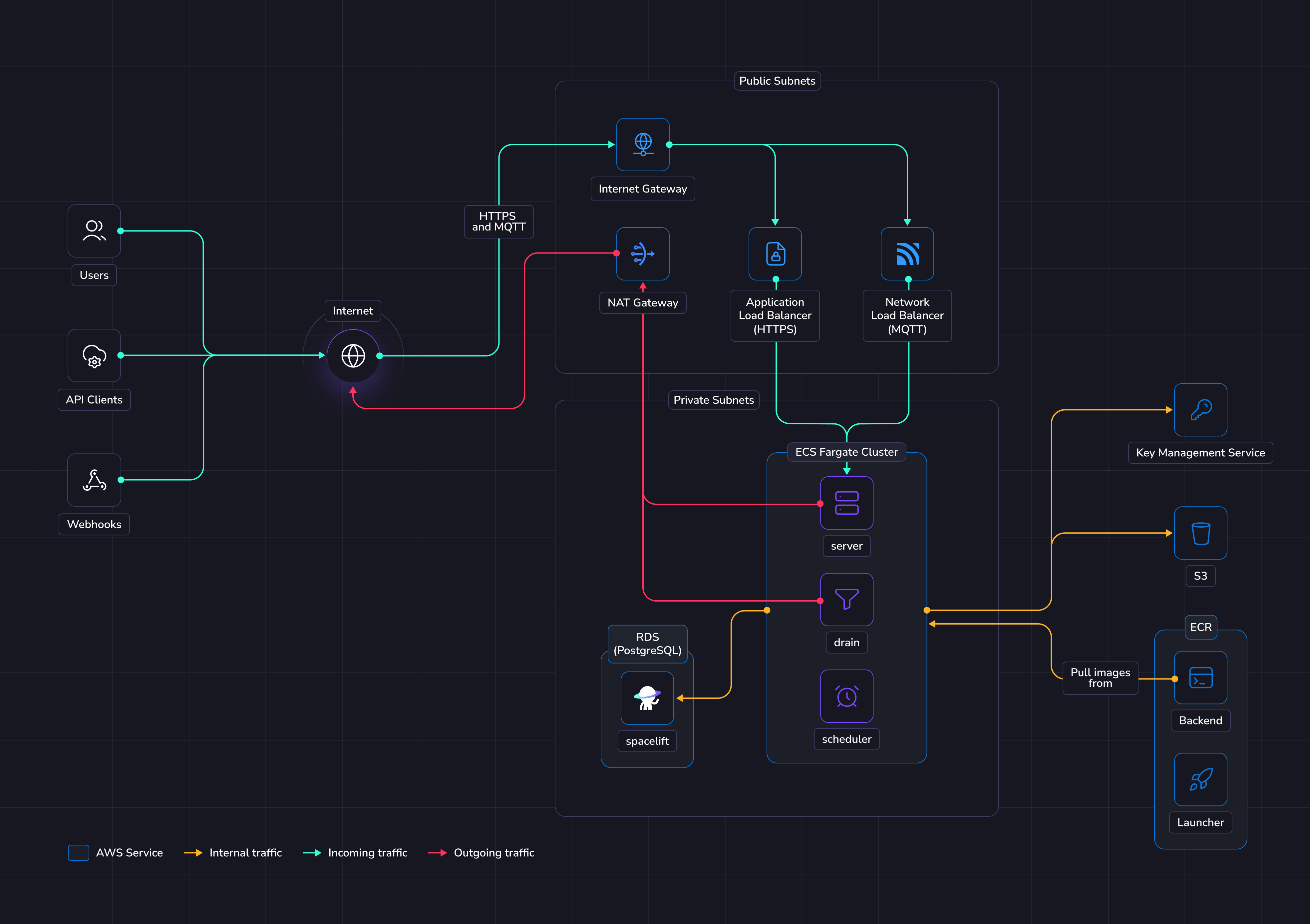 The illustration below shows what the infrastructure looks like when running Spacelift in ECS.