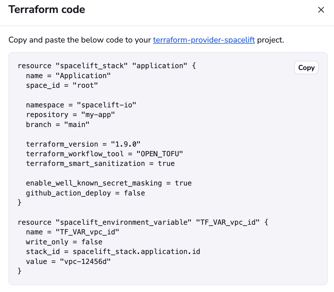 The resulting code will be displayed in a drawer. It includes all stack settings, as well as environment variables and attached contexts. You can copy it to your clipboard and paste it into your Terraform project.