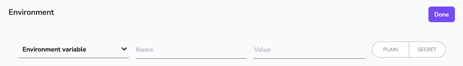 Perhaps you may have noticed how environment variables and mounted files come in two flavors - plain and secret. Here they are in the form for the new environment variable: