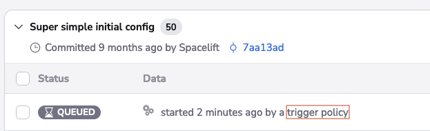 Tracked runs can also be triggered by Git push and tag events. By default, whenever a push occurs to the tracked branch, a tracked run is started - one for each of the affected stacks. This default behavior can be extensively customized using our push policies.